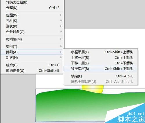 3、使用[椭圆]工具绘制一个太阳形状,然后设置其填充颜色[径向渐变]的颜色,选择[修改]|[排列]|[移至底层]命令。将太阳图形移至地面图形下面如图。