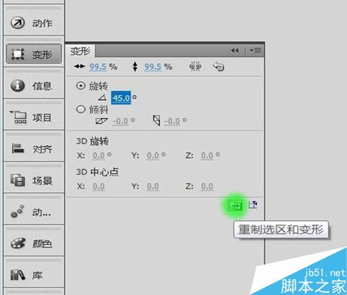 5、选择[任意变形]工具,将光芒的中心移到太阳的中心,启用[旋转与倾斜] 按钮,打开[ 变形] 面板,在[ 旋转] 角度后设置45°角。如图。