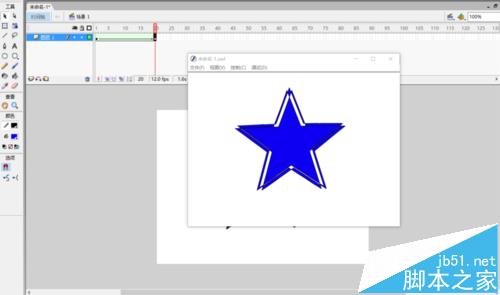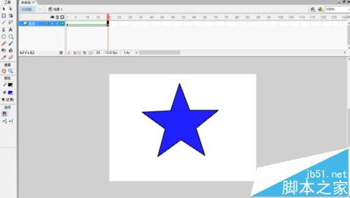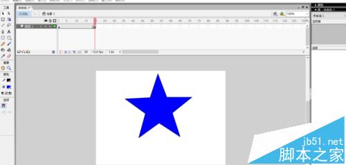 3、填充色选择蓝色,画出一个五角星,用选择工具调整五角星的位置,这样动画的开始形状和结束形状就确定好了。