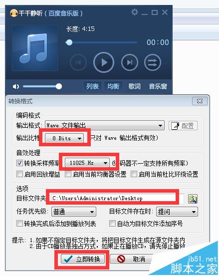 6、按下面红色框架里面参数设置,当然格式也可以MP3,我这里用的是WAV.