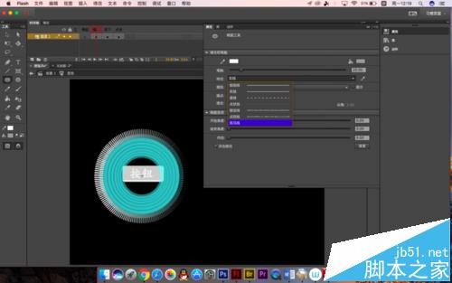 2、我们先来做那个外环,效果是经过会出现,会跟随鼠标移动,点击会变色,所以先需要有一个环,第一帧是没有的,在第二帧处插入关键帧,选择椭圆工具,设置属性,笔触增大到20,斑马线