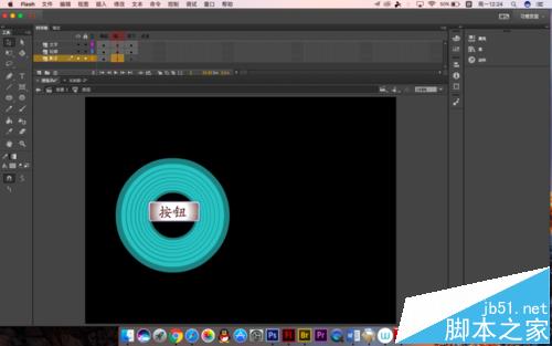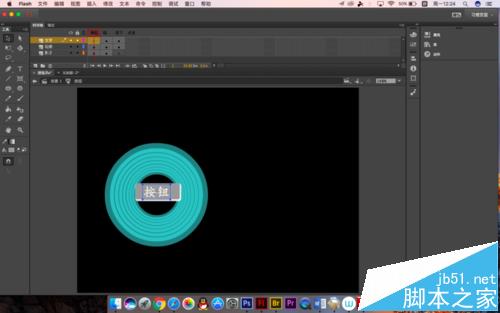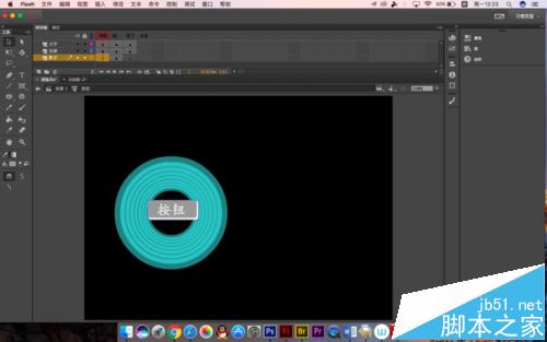 8、前半部分基本是完成了,大家可以试下效果,里面的按钮是一种传统的按钮制作方法,小编只说几个关键点,K帧的位置大家都看见了,所以就不一一指明了,要建立三个图层,分别放置轮廓,阴影和文字