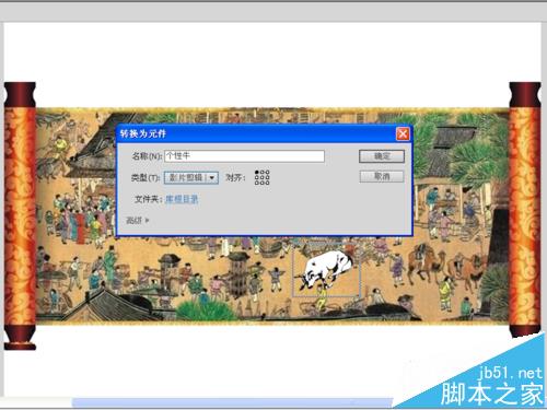 4、选择“牛.png”这幅图片,右键单击从下拉菜单中选择转换成元件选项,在弹出的对话框中输入名称为“个性牛”,类型为影片剪辑,点击确定按钮。
