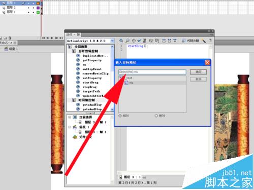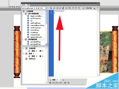6、选择图层3的第一帧,打开动作面板,找到全局函数-影片剪辑控制-startdrag选项,插入startDrag();