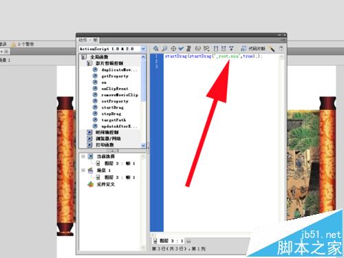 8、接着修改代码startDrag();为startDrag(startDrag("_root.niu",true););