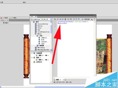 9、将光标置于下一行,找到actionscript2.0类-影片-mouse-方法-hide选项,将其插入。