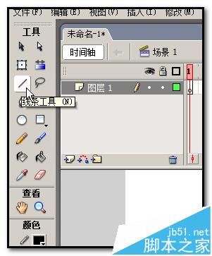 1、新建flash8文档;点选“线条”工具,在文档上画出一条横直线;直线宽度为135;