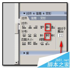 4、然后,在文档中画出一个宽度和高度都是115的正圆形;用“选择”工具把圆形选中,然后,在“对齐”面板中,把“相对于舞台”按钮按下;然后分别点击“水平居中分布”和“垂直中齐”图标;把圆形设置为相对于舞台居中;