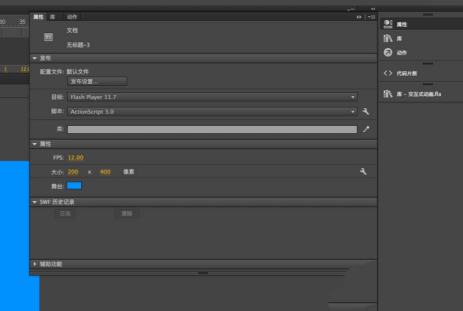 2、然后在属性面板上设置舞台参数,帧频率改为12,尺寸200*400,背景颜色为蓝色,大家喜欢什么样的蓝色都可以