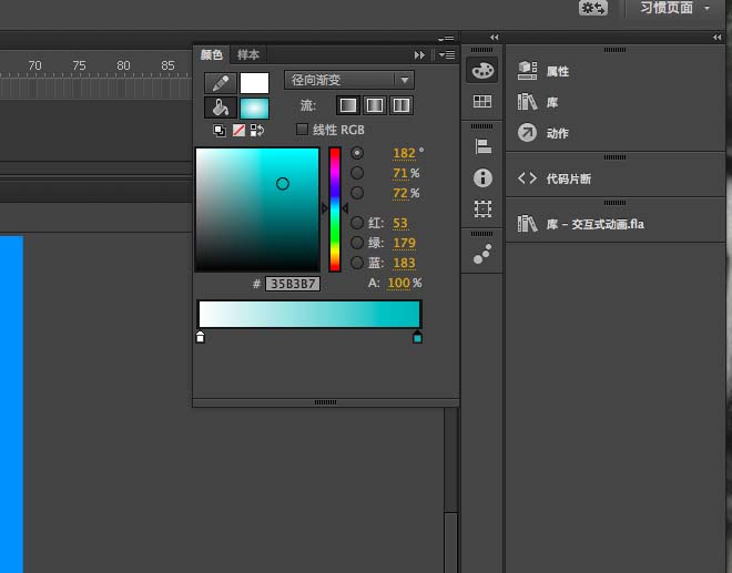 4、选择颜料桶工具,最下面的黑白渐变,然后打开调色板,黑色改为淡蓝色,填充水滴