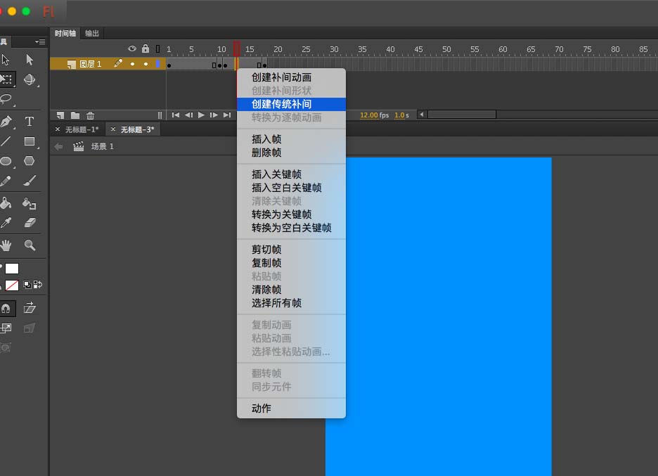 10、在第11帧与16帧中间任选一帧,右击创建传统补件,前面的也是如此