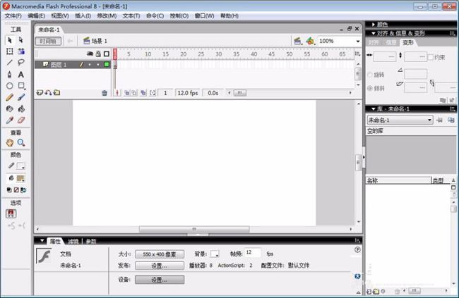1、打开flash软件应用程序,这里我用的是flash 8,界面如下图所示,不同版本界面和窗口布局是有所不同的。
