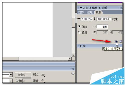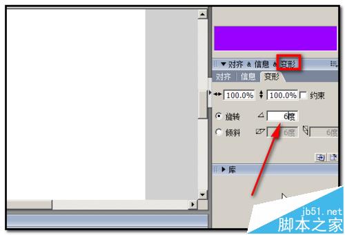 3、再在舞台右侧这里点开“变形”面板;在面板这里的“旋转”输入框输入6;