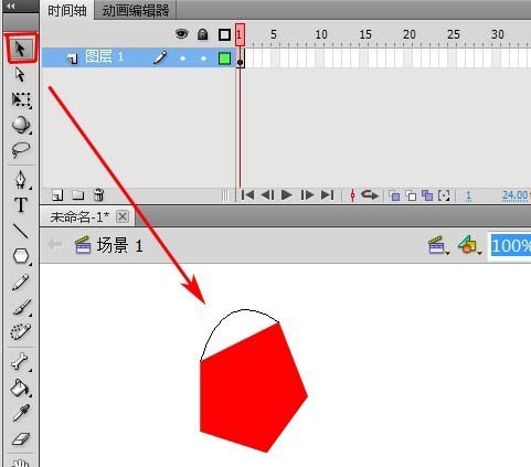 6、选中“选择工具”,让鼠标指向五边形的任意一条边上,当鼠标附近出现曲线指针时,拖动鼠标来调整曲线。