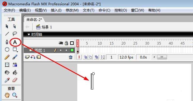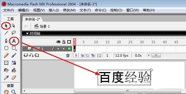 1、首先打开FLASH软件,新建一个FLASH文档,这时候大家可以看到左侧的工具箱中有个字母A,这就是FLASH的文本工具,我们可以点击一下这个工具然后在舞台上点击一下,开始输入文字。