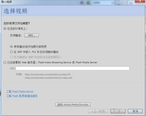 11、 使用组件加载外部FLV。在导入视频窗口中,首先出现的是选择视频项,要求我们选择视频。因为在上一步我们采用了“拖放”的方法,所以已经解决了选择视频的问题。故,我们只要采用默认的模式就可以了。点窗口底部的“下一步”按钮即可。