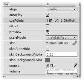 19、 在FLV文件“属性”面板里微调。如果想进一步精雕细刻,还可以在属性面板里详细设置对齐方式、是否自动播放、设置脚本提示点、列表、模式、皮肤、音量,亦可更改数据源。方法是先点一下舞台上的视频实例,这时就会在窗口右边出现属性面板。如下图。开始设置吧。
