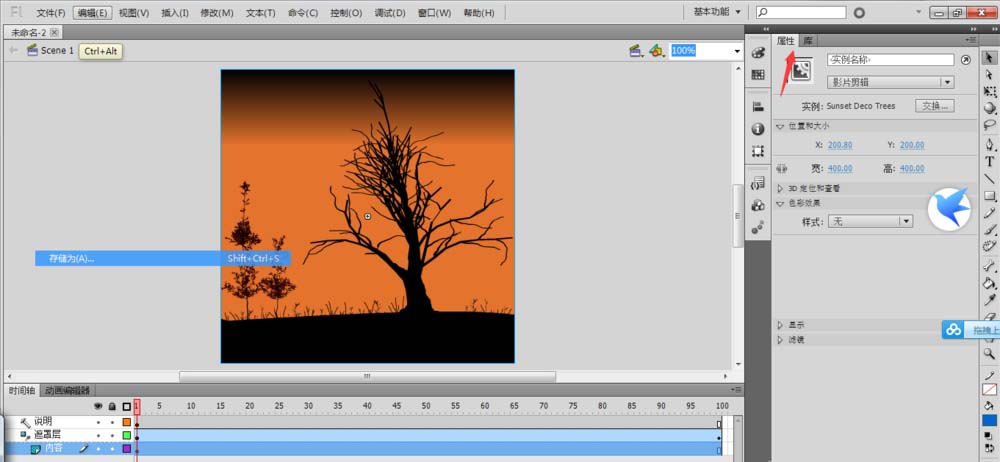 3、单击选中场景中需要调整透明度的对象。单击选中场景中需要调整透明度的对象。在“窗口”菜单—“属性”,或者按Ctrl+F3将属性面板调出来。