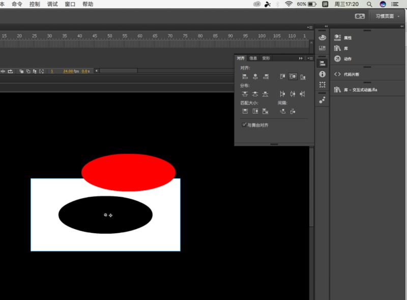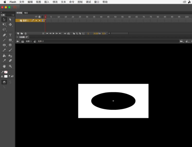 3、然后回到舞台上,再次建立元件,还是图形,这次画一个矩形出来,比椭圆要大,然后把椭圆拖进去对齐到舞台中央