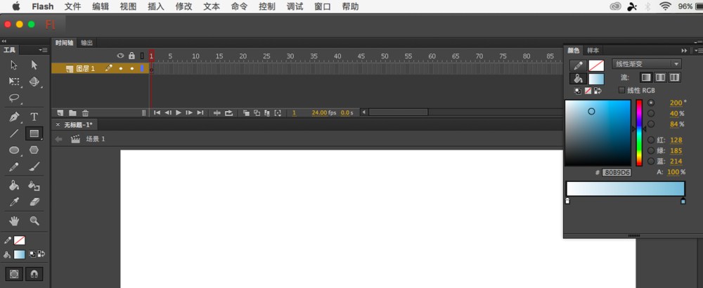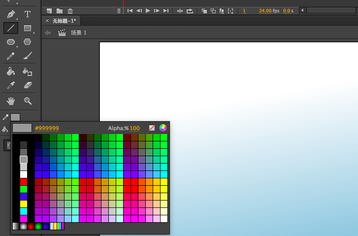 2、我们需要建立一个渐变的棋盘,但是舞台只能用纯色填充,所以我们用矩形工具绘制一个,改变一下填充色