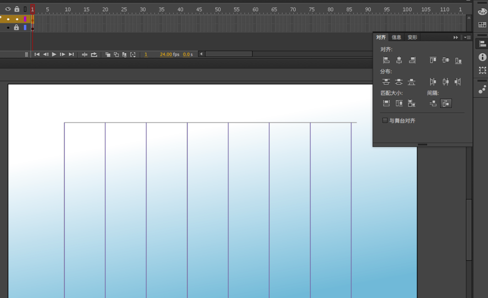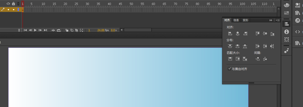 3、然后运用对齐,使整个画布与舞台大小,绘制的时候不需要严格控制矩形大小,之后会自动调整