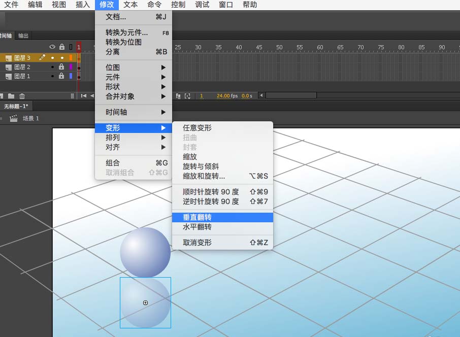 11、然后根据镜面对称,垂直翻转一下,这样一个小球就做好了,新建一个图层,复制出另一个小球