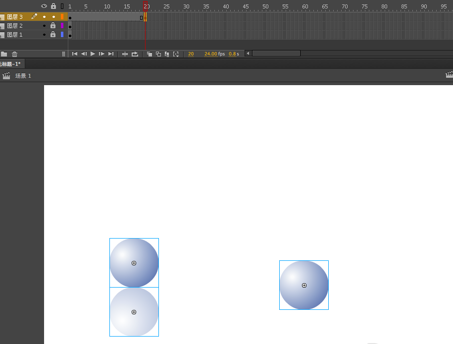 12、将背景与棋盘都延续,根据小球的位置,按照近大远小的原理稍微改变小球大小,然后在第20帧处插入关键帧,将小球变小移到后面去
