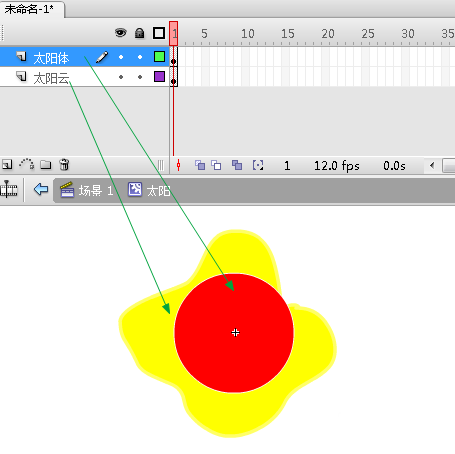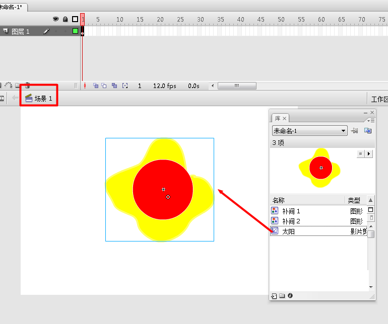 5、接着返回“场景1”,将“太阳”元件从库拖动到此场景中。