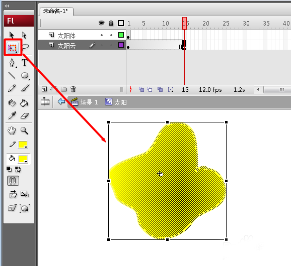 3、在“太阳云”第15桢右击,选择插入“关键桢”项,然后利用“变形”工具,对太阳云进行形状变形。