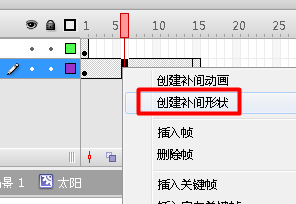 4、右击“太阳云”两关键桢之间,从弹出的菜单中选择“创建补间形状”项。