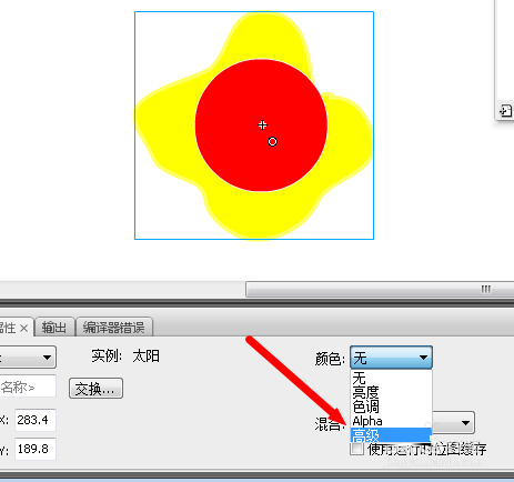 6、在第20桢右击,插入“关键桢”。选中场景中的元件,在“属性”面板中点击“颜色”下拉列表,选择“色调”项。