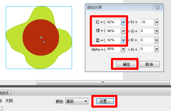 7、然后点击“设置”按钮,在弹出的“高级效果”面板中,将元件进行适当的设置。
