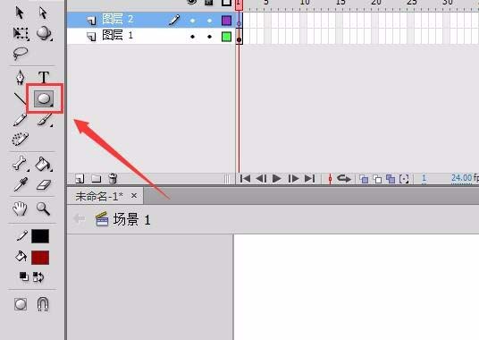 4、用鼠标左键在舞台上拖拽,绘制一个椭圆形,在选择椭圆工具,设置笔触颜色为红色,填充色为红色,笔触大小为3,如图所示: