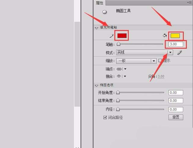 3、点击椭圆工具,在属性里设置笔触颜色为红色,填充色为黄色,笔触大小为3,如图所示: