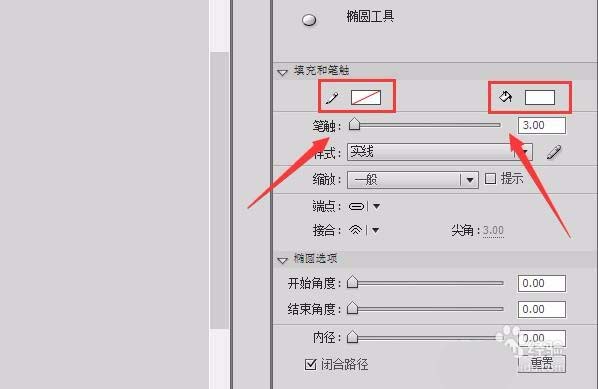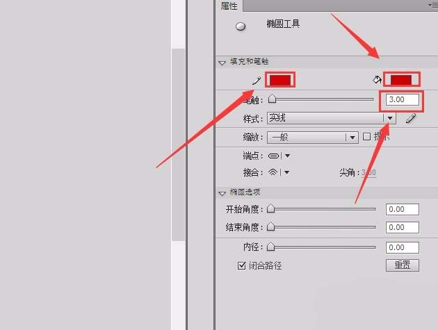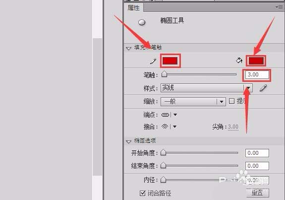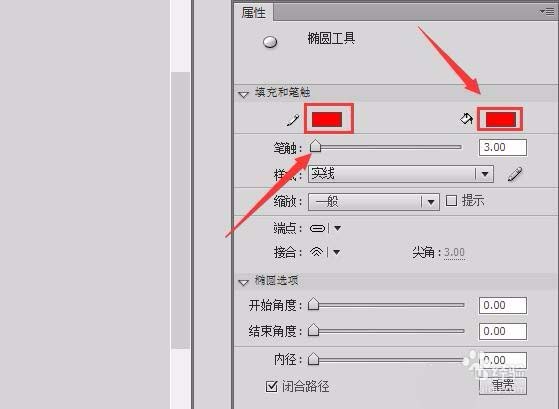 6、在选择椭圆工具,设置笔触颜色为红色,笔触大小为3,填充色为红色,如图所示:
