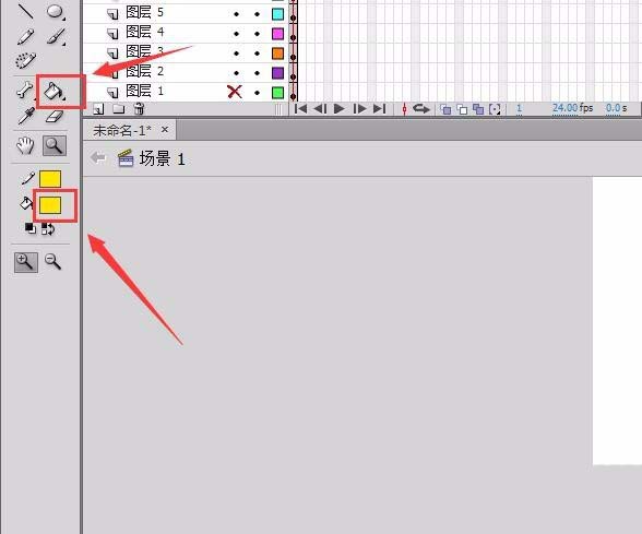 27、在工具箱内找到填充工具,将填充颜色设置为黄色,如图所示: