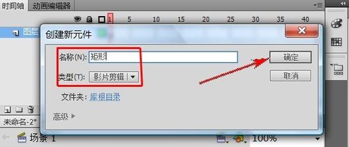 3、按“Ctrl+F8”新建一元件,名称为“矩形”,类型为“影片剪辑”,单击“确定”按钮。