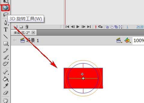 6、在工具栏中选择“3D旋转工具”,影片剪辑的 X、Y 和 Z 三个轴将显示在舞台上对象的顶部。