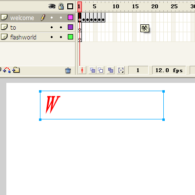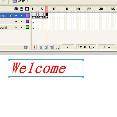 6、再次选中welcome的第一帧,双击"Welcome",删除后面六个字母,只留下"W",如图,用同样的方法,第2帧留下"We",第3帧留下Wel,直到第7帧保留完整的Welcome。