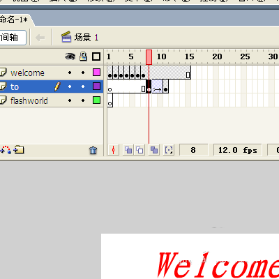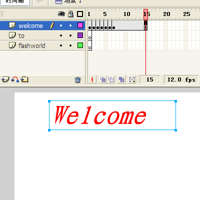 7、选中welcome层的第15帧,按下F5键(插入帧)。