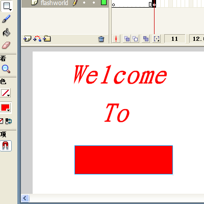 11、在flashworld层的11帧中插入关键帧。单击工具箱中的矩形工具,在颜色面板中选取相应的颜色。再在舞台中央画出一个长条矩形。