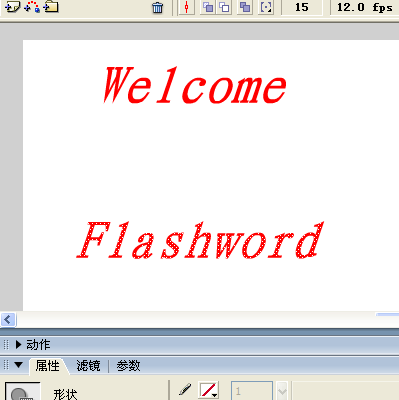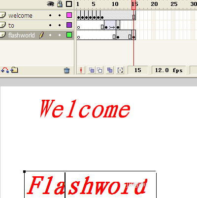 12、在flashworld图层的第15帧按F6插入一个关键帧,并删除舞台上的矩形。再次选取文本工具,在原来的矩形位置输入文字"flashword",按两次Ctrl+B组合键分离文字对象。如图所示。
