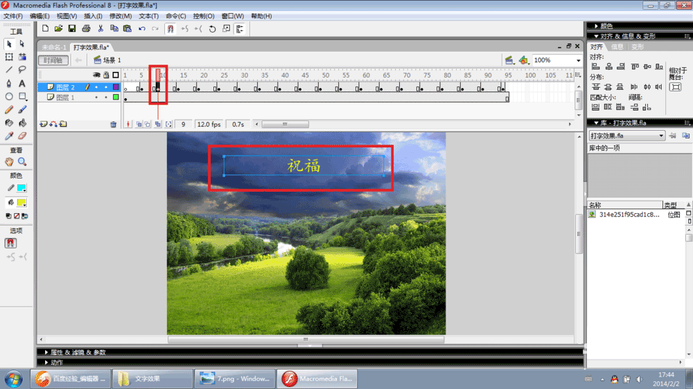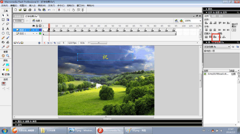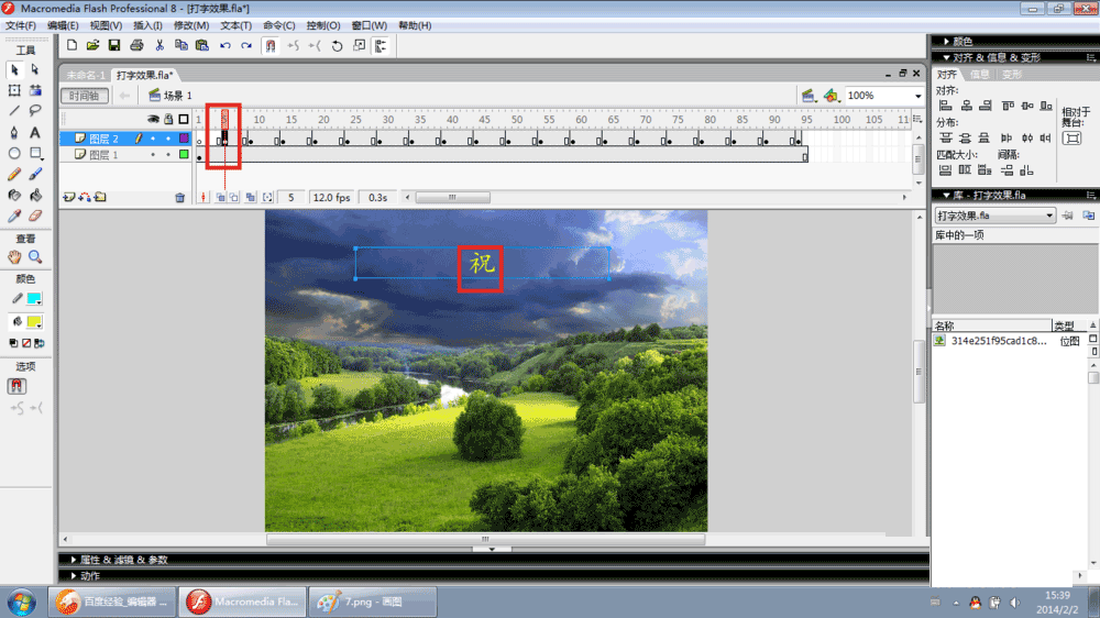 3、选中第5帧——文本工具——选中舞台上文字——删除文字,只保留第一个字。