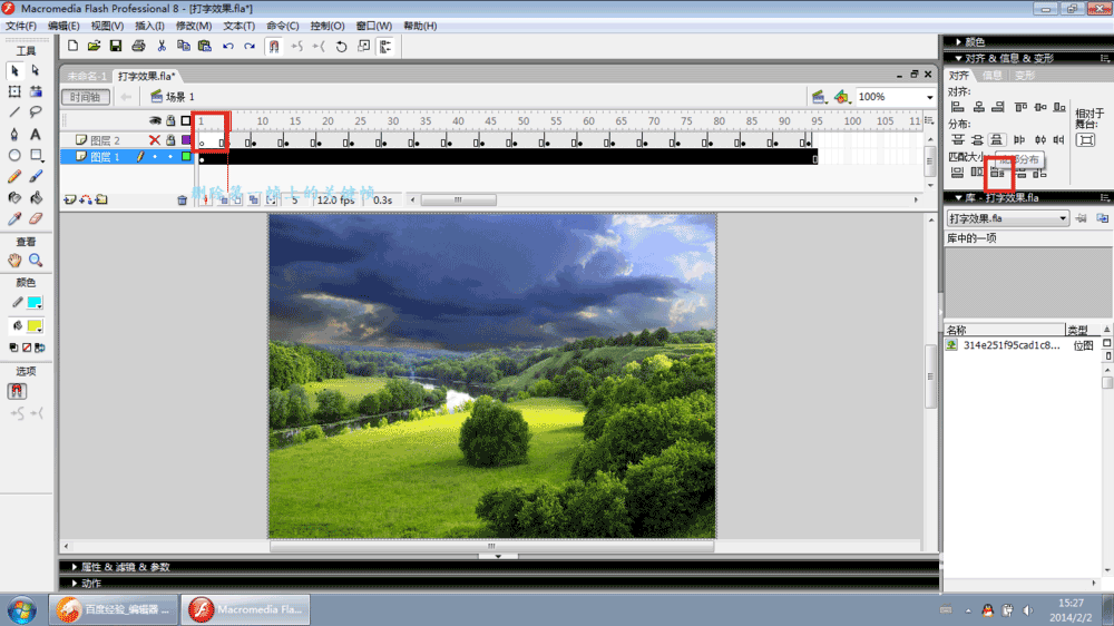 1、首先,打开flash界面,导入背景素材到库中。并将库中的背景拖至舞台,匹配宽和高(右上方对齐中)。