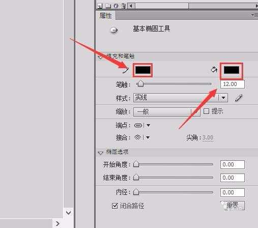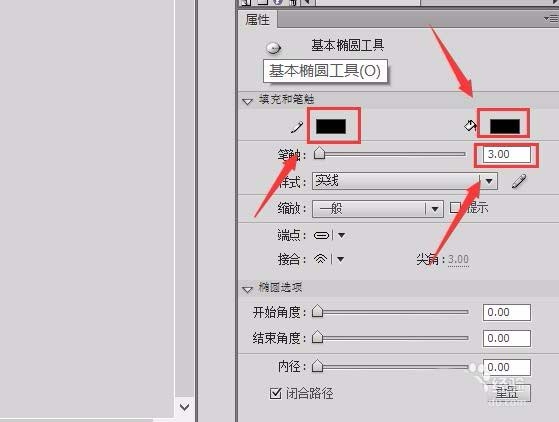 3、点击椭圆工具,在右侧的属性里调节笔触颜色为黑色,填充色为黑色,笔触大小为3,如图所示: