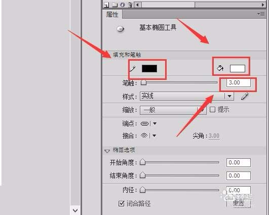 12、在工具箱内找到椭圆工具,在属性里设置笔触颜色为黑色,笔触大小为3,填充色为白色,如图所示: