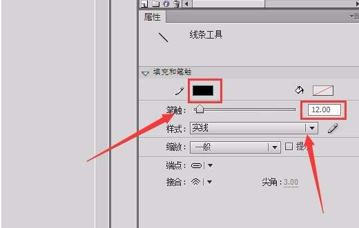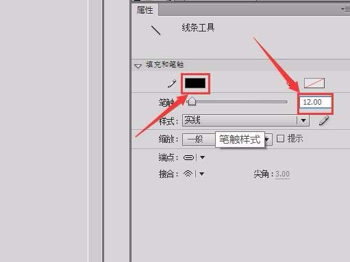 18、在属性里调节直线的颜色为黑色,笔触大小为12,如图所示: