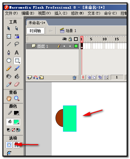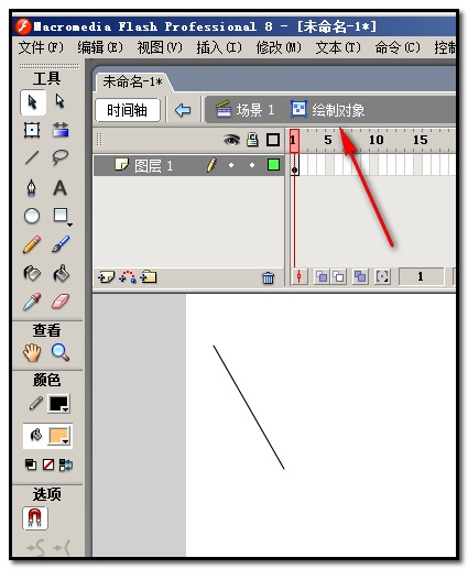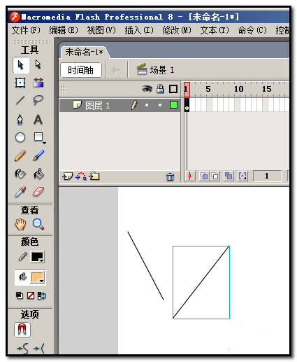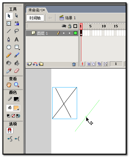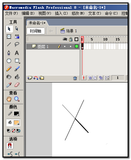 8、若使用“绘制对象”来画直线的话,这个问题就解决了。鼠标点线条工具后,再按下“绘制对象”,然后在舞台上画两条直接并相交,如下图所示。