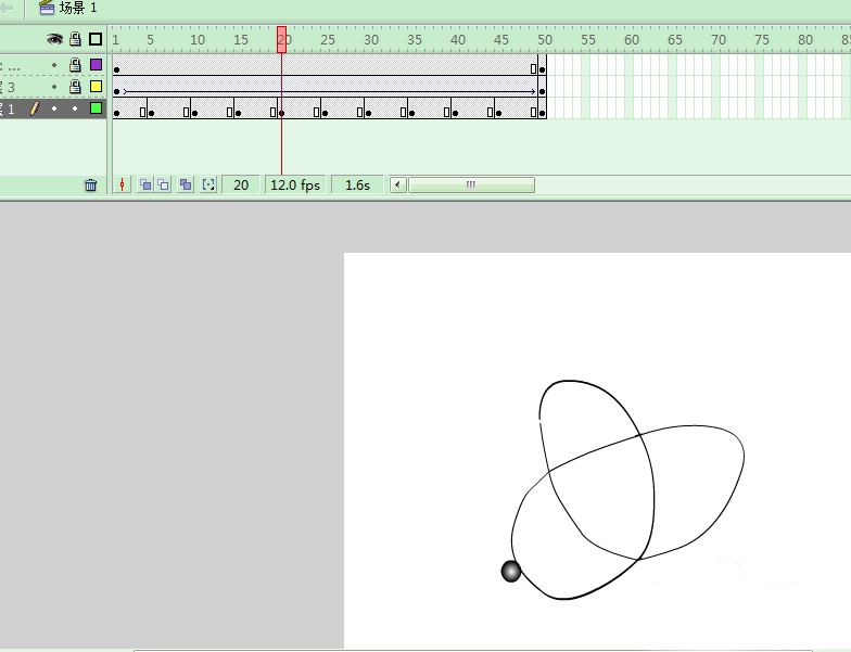 5、添加图层3,绘制一个小球,转换为元件;并且设置第50帧为关键帧,添加补间动画;
