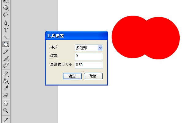 3、然后,在舞台上画一个圆;画好后,再复制一个。并把它移到合适位置(如下图),然后再在矩形工具那一项找到多边形工具,然后再在右边的属性面板中找到一个选项按钮,点击按钮,就会弹出一个对话框(如下图),改变样式为多边形,边数为3,单击确定。